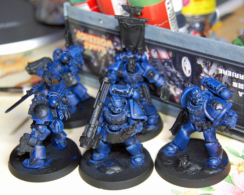 Dado que el color de la armadura es oscuro, la imprimación que he usado es negra (en spray). Tras ello, he aplicado un par de capas de Imperial Blue de Vallejo Game color. Empecé con Regal Blue de Citadel, pero la pintura era demasiado acuosa como para agarrar bien, de modo que me pasé al siempre fiel Vallejo.