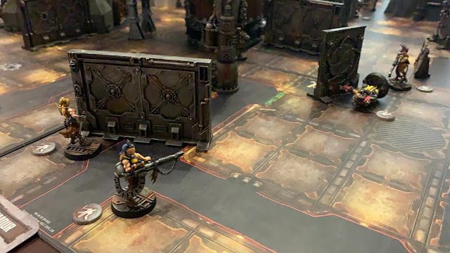 El campeón del fondo de la foto de arriba, decide no arriesgarse con el Ambot y carga contra uno de los nuevos refuerzos, la Escher del lanzallamas. Para su desgracia, no logra dar una (seguramente la ametralladora pesada era eso, demasiado pesada) y la Escher le deja Malherido en el ataque de vuelta. El líder Orlock, por su parte, sube las escaleras para alejarse del Ambot.